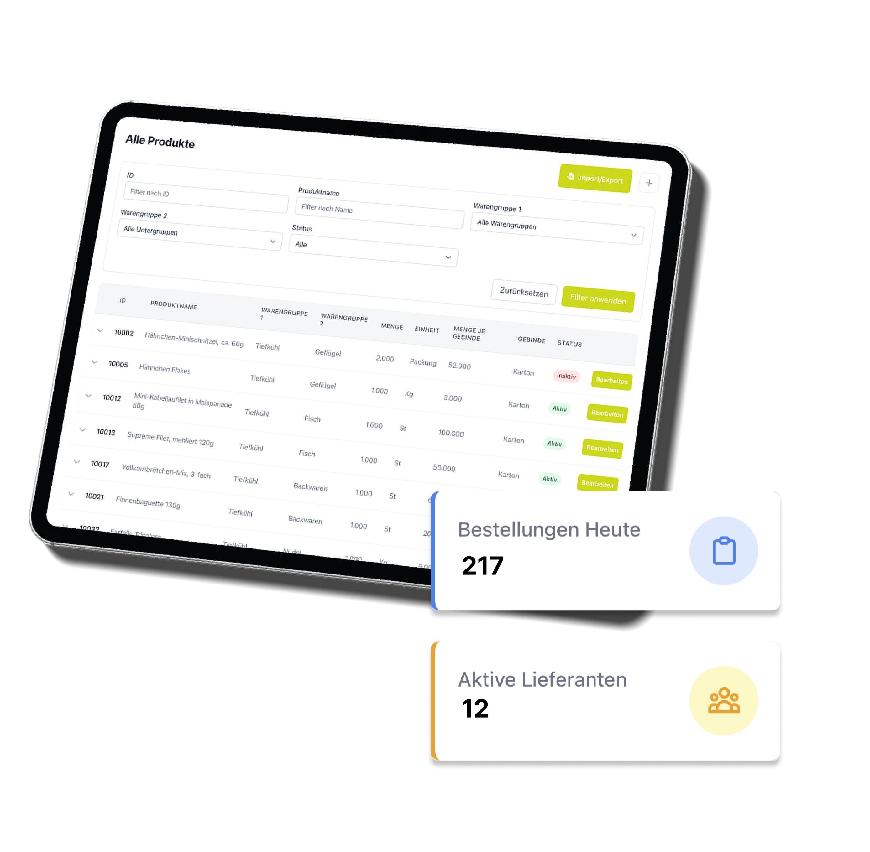 Das Bestellsystem berechnet Mengen automatisch basierend auf Ihrem Speiseplan, den aktuellen Lagerbeständen und vergangenen Bestellungen.